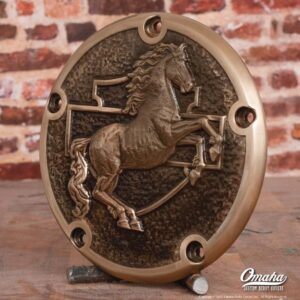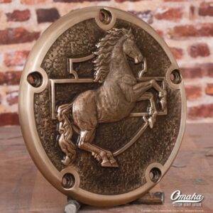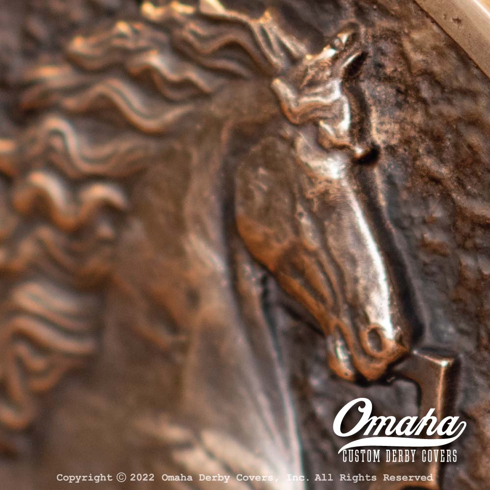 All custom derby covers are made to order. Approximate production lead time is eight to twelve weeks, but is not guaranteed. If you have a situation (an upcoming ride, an event, etc) that means you need it sooner, please contact me first and I will see what I can do. Please understand that I really do make these by hand in my own shop. Bronze art casting will always have a certain failure rate, and I will not ship a custom derby cover I am not proud of.